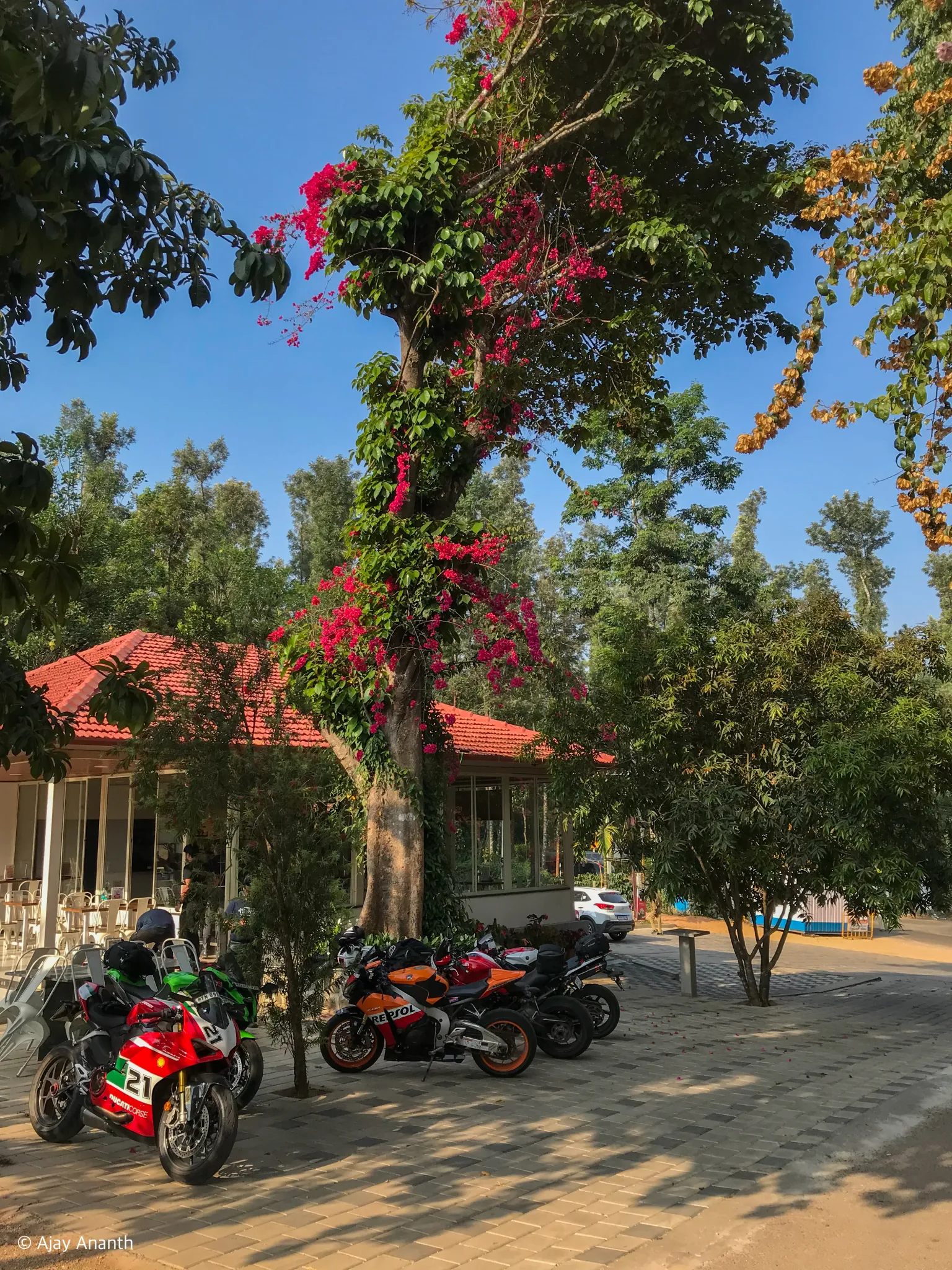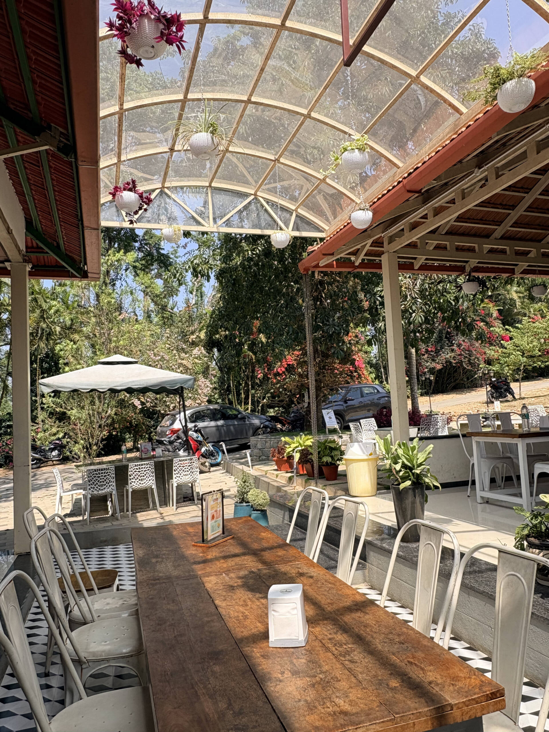 from the historic Chennakeshava Temple. Surrounded by coffee plants, pepper vines, and cardamom groves, the café reBlects the